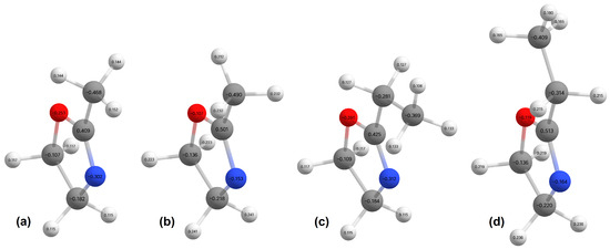 The B3LYP/GTBas3 optimal geometries with charges on atoms (hydrogens—white, carbons—grey, nitrogen—blue, oxygen—red) for (a) neutral and (b) cation 2-methyl-2-oxazoline, as well as (c) neutral and (d) cation 2-ethyl-2-oxazoline.