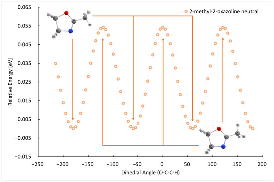 The B3LYP/GTBas3 potential energy surface scan as a function of O-C-C-H dihedral angle of neutral 2-methyl-2-oxazoline, with three identical ground state geometries labeled with arrows down, and three identical transition state geometries labeled with arrows up.