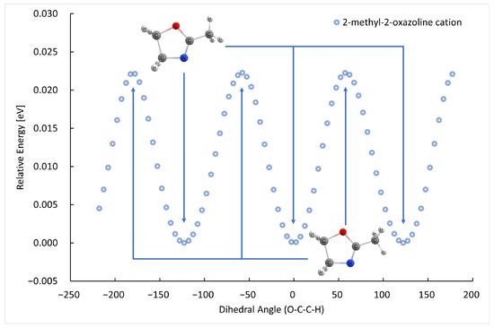 The B3LYP/GTBas3 potential energy surface scan as a function of O-C-C-H dihedral angle of cation 2-methyl-2-oxazoline, with three identical ground state geometries labeled with arrows down, and three identical transition state geometries labeled with arrows up.