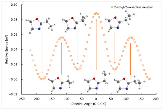 The B3LYP/GTBas3 potential energy surface scan as a function of O-C-C-C dihedral angle of neutral 2-ethyl-2-oxazoline, with one ground state geometry and two identical conformational isomers labeled with arrows down, and the corresponding transition state geometries labeled with arrows up.