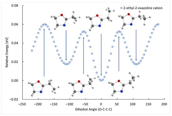The B3LYP/GTBas3 potential energy surface scan as a function of O-C-C-C dihedral angle of cation 2-ethyl-2-oxazoline, with one ground state geometry and two identical conformational isomers labeled with arrows down, and the corresponding transition state geometries labeled with arrows up.