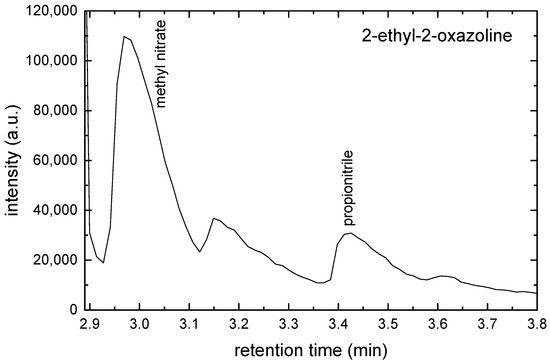 The methyl nitrate and propionitrile were identified in this chromatogram. The peak at a retention time of 3.15 min was not unambiguously identified.