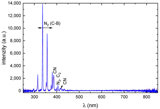 The spectra were measured using an Ocean Insights spectrometer, Flame T, FLMT10459 (Ocean Optics, Inc., EW Duiven, The Netherlands). The measurements were performed with an integration time of 1.5 s and 10 s for low signal observation. A 4 m long, 600 m diameter quartz optical fiber was used for the measurements. The fiber was brought to the side of the gap between the discharge electrodes at a distance of 1 cm.