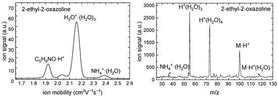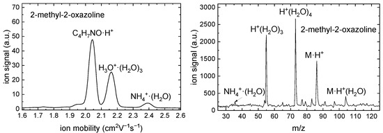 The 2-methyl-2-oxazoline and 2-ethyl-2-oxazoline were studied using a home-made Ion Mobility Spectrometry (IMS) instrument well described in previous works [58,59,60]. The instrument was equipped with a point to plane corona discharge–atmospheric pressure chemical ionisation (CD-APCI) ion source, operated in the positive polarity and in reverse gas flow mode. The principle of IMS ion separation is based on the drift time of the ions in a homogeneous electric field along the drift tube filled with a drift gas. A voltage of 8 kV was applied to the whole drift tube of IMS to provide a drift field of 680 V . As a drift gas purified ambient air was used with a gas flow of 600 mL/min, while the sample flow was set to 50 mL/min. The micro-splitter valve (Supelco, Bratislava, Slovakia) controlled the sample flow rate was used and adjusted by a gas flow meter Platon NG (CT Platon, Saint-Etienne, France). The ion mobility scale has been calibrated using 2,6-di-tert-butylpyridine (Sigma-Aldrich, Bratislava, Slovakia) as a standard compound with the well-known reduced mobility of 1.41 . The IMS was operated at a sub-atmospheric pressure of Pa and at 373 K. In the ionisation source, the reactant ions (RI) ·(H2O)3,4 were generated, which were used for the chemical ionisation of studied compounds. The IMS and MS spectra of the RI were measured on a standalone IMS and an orthogonal acceleration time-of-flight mass spectrometer (oa-TOF-MS).