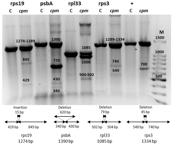 Interestingly, digestion bands were only visible when cpm DNA was mixed with WT DNA, as in the case of the rps19 and rps3 amplicons. In contrast, for the psbA and rpl33 amplicons, digestion bands were detected using cpm DNA alone. These results suggest that the indels in psbA and rpl33 amplicons are present in a heteroplastomic state, while those in rps19 and rps3 amplicons are homoplastomic.