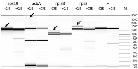 Virtual gel image of CJE digestions analyzed using the Fragment Analyzer™ system (Agilent, Santa Clara, CA, USA) for heteroduplexes derived from amplicons containing large indels: rps19, psbA, rpl33, and rps3. Arrows indicate the presence of heteroduplex bands prior to CJE digestion (-CJE), which disappear following digestion (+CJE), confirming successful cleavage. M: molecular weight marker (100 bp ladder). “+” denotes the positive control for CJE digestion, consisting of a cpm mutant carrying a TA insertion in the middle of the psbC gene.