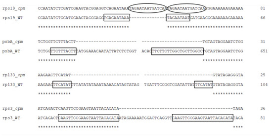 Sequence alignments of amplicon regions flanking the large indels in cpm mutants compared to WT control seedlings. Direct repeats are highlighted with boxes, and the duplicated sequence within the insertion in the rps19 amplicon is indicated with an ellipse. Gaps in the psbA and rpl33 alignments represent discontinuities in the sequence. Asterisks (*) denote identical nucleotides across the aligned sequences.