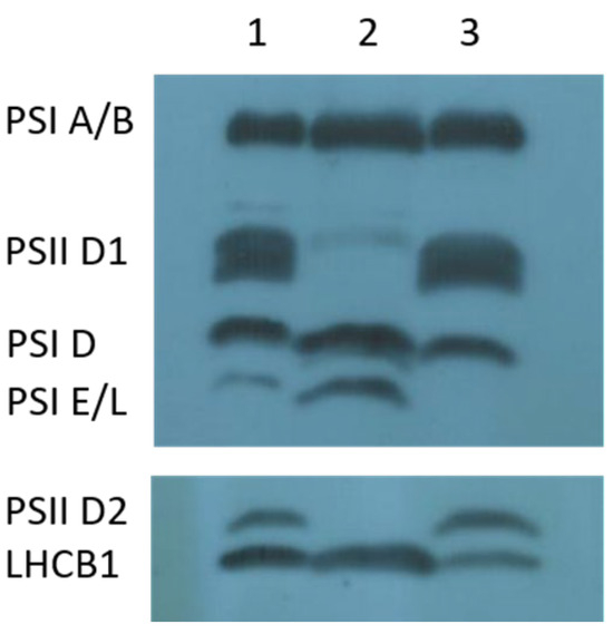 Immunoblot analysis of photosystem proteins in the cpm mutant homoplastomic for the 620 bp deletion in the psbA gene (viridis phenotype) and in normal green cpm siblings. Lanes 1 and 3: normal green siblings; Lane 2: viridis mutant. The blot shows altered expression of photosystem II (PSII) core proteins (D1 and D2) in the mutant, while photosystem I (PSI) core proteins and PSII associated light-harvesting antenna (LHCB1) are expressed at comparable levels in both mutant and normal green cpm siblings.