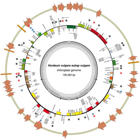 Polymorphisms identified in the chloroplast genome of seedlings carrying large indels by Next generation sequencing (NGS). Orange bars and arrows indicate the regions of the barley chloroplast genome that were previously analyzed using chloroplast Targeting Induced Local Lesions in Genomes (cpTILLING). Black asterisks mark novel polymorphisms identified by NGS in regions not previously examined. Blue asterisks denote polymorphisms that were detected both in previous studies using CJE digestion and in the present study using NGS. Red asterisks highlight polymorphisms newly identified in this study by NGS that were not detected by CJE digestion in earlier analyses.