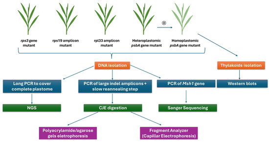 Schematic diagram of the experimental design. The four seedlings carrying the large indels were subjected to DNA isolation followed by molecular and genomic analyses. Only homoplastomic psbA mutant offspring of the heteroplastomic psbA gene mutant was analyzed at the protein level by western blot. ⮾ means self-pollination.
