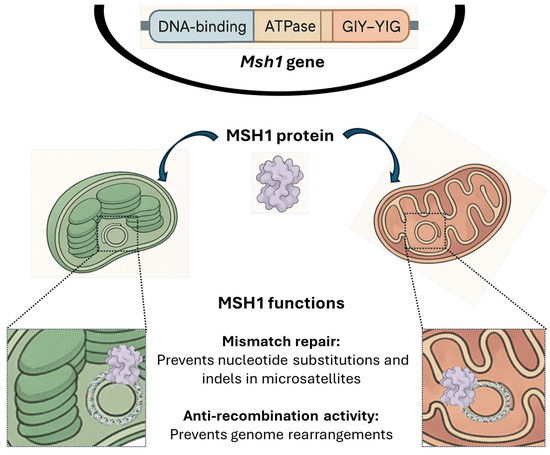A general scheme of MSH1 protein showing its localization and functions in plants. At the top, the Msh1 gene in the nucleus, highlighting its functional domains: DNA-binding, ATPase, and GIY-YIG endonuclease. Subcellular localization of MSH1 is shown, indicating its presence in chloroplasts (left) and mitochondria (right) and its interaction with the DNA molecules of both organelles. The bottom panel summarizes the main functions of MSH1: mismatch repair, which prevents nucleotide substitutions and indels in microsatellites, and anti-recombination activity, which suppresses genome rearrangements. Part of the figure was generated with the assistance of the ClickUp Brain artificial intelligence tool [45].