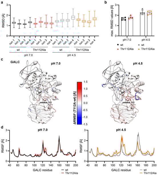 In order to provide a comprehensive description of the functional effects of the Thr112Ala mutation at the atomic level, it is not sufficient to analyze only the static structure. Therefore, molecular dynamics (MD) simulations were conducted. These MD simulations were performed on the GALC protein in its wild-type form and also with the Thr112Ala missense mutation. An empty substrate-binding pocket was selected to resemble the structural state prior to the entry of a substrate molecule into the binding pocket, with the objective of maximizing the flexibility of the substrate-binding pocket. The protonation of the residues in GALC was selected to match cytosolic (pH 7) or lysosomal pH (pH 4.5) in order to simulate the conditions that prevail in some experimental setups (pH 7), but more importantly, to choose the conditions that are natural for a lysosomal protein (pH 4.5) such as GALC. To enable statistical analyses, four simulation runs were performed for all four cases (wt GALC at pH 7.0 and pH 4.5, as well as GALC with Thr112Ala at pH 7.0 and pH 4.5).
