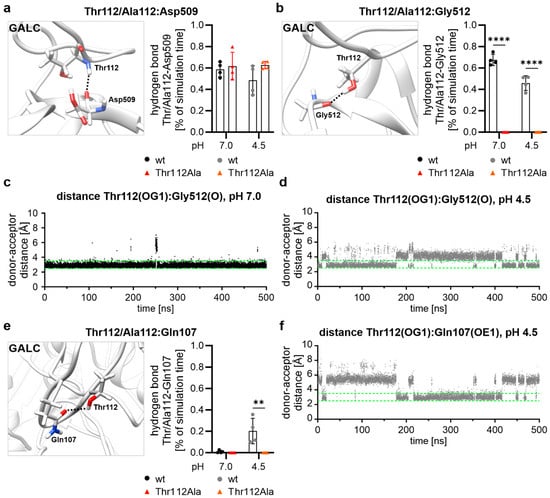 Hydrogen bonds of Thr/Ala112. (a) Structural representation of the hydrogen bond (indicated by a black dashed line) between the backbone atoms of Thr112 and Asp509. Asp509 is shown with protonated side chain. Hydrogen bond occurrence was measured for each simulation run of the wild type and the GALC variant with Thr112Ala and at each pH value. (b) Structural representation of the hydrogen bond (indicated by a black dashed line) between the hydroxyl group of Thr112 and Gly512. Hydrogen bond occurrence was measured for each simulation run of the wild type and the Thr112Ala variant at both pH values. The GALC variant with Thr112Ala is not able to form this hydrogen bond due to the non-polar alanine side chain. (c,d) Time-resolved distance plot for simulation run 1 describes the distance between the donor and acceptor atoms of the atoms of Thr112 and Gly512 in the wild type at pH 7.0 (c) or at pH 4.5 (d) (green dashed lines: distances within these values are defined as hydrogen bonds). (e) Structural representation of the hydrogen bond (indicated by a black dashed line) between the hydroxyl group of Thr112 and the side chain of Gln107. Hydrogen bond occurrence was measured for each simulation run of the wild type and the Thr112Ala variant at both pH values. Due to the non-polar alanine side chain, the GALC variant with Thr112Ala is not able to form this hydrogen bond. (f) Time-resolved distance plot for GALC wild-type simulation run 1 at pH 4.5 describes the donor–acceptor distance of the Thr112:Gln107 hydrogen bond over the simulation time (green dashed lines: distances within these values are defined as hydrogen bonds). (a,b,e) Mean values ± SD are shown as bar graphs (n = 4). Statistical testing was performed in GraphPad Prism (V10) using 2-way ANOVA with Šídák’s multiple comparisons test (** p < 0.01, **** p < 0.0001).