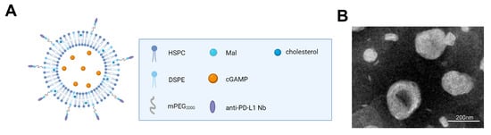 To prepare the nanoantibody-targeted liposome complex (XA5508), the Nb were modified with sulfhydryl groups according to the previous method []. The free sulfhydrylating reagent was removed by dialysis. The ammonium sulfate gradient method was used to prepare liposomes. To prepare fluorescent-labeled liposomes for in vivo fluorescence imaging, the near-infrared fluorescent probe DiR was loaded into the liposomes. In simple terms, the above lipids were dissolved in chloroform and evaporated to form a film at 40 °C. The ammonium sulfate solution was added to the phospholipid membrane and rotated to form multilayer liposomes. The liposomes were squeezed through a polycarbonate filter (Avastin) to obtain uniformly sized single-layer empty liposomes. After dialysis to remove the ammonium sulfate solution, the blank liposomes were obtained. The cGAMP solution was added to the blank liposomes, incubated at 60 °C for 1 h, and then dialyzed to remove the unencapsulated drugs. The sulfhydrylated nanoantibodies were added to the drug-loaded liposomes, incubated in the dark overnight, and then dialyzed to remove the free nanoantibodies.