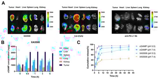 To examine whether the liposome complex XA5508 has tumor-targeting properties, we injected mice with subcutaneous tumors with DiR-labeled XA5508, Lip-empty, and anti-PD-L1 Nb via the tail vein. After 48 h, the distribution of the biological tissues through IVIS imaging was observed. As shown in Figure 2A, XA5508 mainly accumulated in the tumor, liver, and spleen, while Lip-empty mainly accumulated in the liver and spleen. Anti-PD-L1 Nb had the weakest fluorescence signal due to its rapid metabolism in the body (Figure S1). These results indicated that the anti-PD-L1 Nb on the surface of the liposome complex can recognize the antigen PD-L1 on the surface of tumor cells, thereby enhancing the internalization of tumor cells by the liposome complex and weakening the RES phagocytosis process. Subsequently, we studied the changes in the content of cGAMP in different tissues at 0, 0.5, 1, 3, and 6 h after tail vein injection of XA5508. The results showed that the content of cGAMP in tumor tissues was obviously higher than that in other tissues, starting from 0.5 h until 6 h (Figure 2B). The release characteristics of cGAMP in the liposome complex XA5508 were verified through in vitro simulated release experiments. As shown in Figure 2C, at the same pH conditions, the release rate of free cGAMP was much higher than that of XA5508. In contrast, XA5508 could slow down the release rate of cGAMP in the simulated neutral environment of blood and accelerate the release in the acidic conditions of the simulated the TME. These results prove that the liposome complex XA5508 has excellent in vivo long circulation and liver tumor targeting effects.