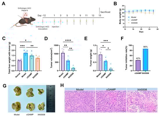 The mice carrying Hepal-6 were randomly divided into different treatment groups: Model group, cGAMP group, and XA5508 group. In this study, when the tumor volume reached 200 mm3, the mice were administered the drug every 2 days for a total of 7 times. The tumor volume was calculated as (L × W2)/2. L represents the maximum diameter of the tumor, and W represents the shorter vertical measurement of the tumor. To test the anti-tumor effect, the free cGAMP group and the XA5508 group were injected with the effective dose of cGAMP through the tail vein, which was 0.2 mg. We conducted a total of three independent and complete experiments. Data from one representative experiment out of 3 total performed. In each independent experiment, the number of samples in each group is n ≥ 3.