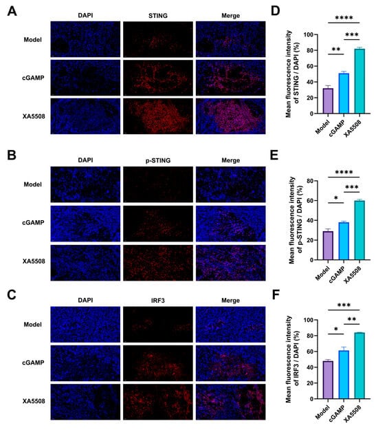 The tumor tissues were washed with pre-cooled PBS (pH 7.4) and then fixed in 4% paraformaldehyde for more than 24 h. After gradient ethanol dehydration, they were embedded in paraffin. Then, the tissues were cut into 5 μm thick sections, and the sections were baked at approximately 50 °C. The dried tissue sections were placed in xylene for decolorization, followed by gradient ethanol hydration. The sections were subjected to antigen retrieval, blocked with 5% BSA for 30 min, and washed with PBS (pH 7.4). The tissue sections were then treated with 0.1% Triton X-100 in PBS (pH 7.4) for 5 min and washed with PBS (pH 7.4). Diluted STING antibodies (Abcam, Cambridgeshire, UK, 1:200, v/v), p-STING antibodies (Abcam, 1:200, v/v), and IRF3 antibodies (Abcam Cambridgeshire, UK, 1:200, v/v) were added for staining of the target proteins and incubated at 4 °C overnight. The sections were washed with PBS (pH 7.4). Fluorescent secondary antibodies (Abcam, 1:200, v/v) were added in the dark for 2 h at room temperature and then washed with PBS (pH 7.4). Finally, the tissue sections were stained with DAPI (Beyotime, Shanghai, China) in the dark for 10 min and then washed with PBS. After the tissue dried, they were sealed with neutral resin and observed and photographed under a fluorescence inverted microscope. Each data point represents one animal (biological replicate). Groups consisted of n = 3 independent animals.