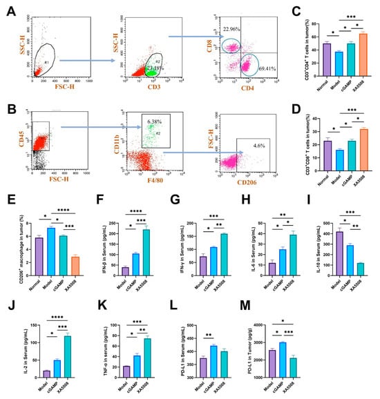 Liposome complex XA5508 reverses the immunosuppressive microenvironment and blocks immune escape. (A,B) Representative classification strategy for tumor tissue detection markers. (C) CD4+ T cells in the tumor. (D) CD8+ T cells in the tumor. (E) M2-TAM in the tumor. Serum samples from each group were collected for detection of (F) IFN-β, (G) IFN-γ, (H) IL-6, (I) IL-10, (J) IL-2, (K) TNFα, (L,M) Expression levels of PD-L1 in serum and tumor of Hepal-6 tumor-bearing mice treated with cGAMP for 7 times. (Data from one representative experiment out of three total performed. n = 3, Data are means ± SEM. One-way ANOVA with Tukey’s HSD significant test were used for pairwise comparisons. *, p < 0.05, **, p < 0.01, ***, p < 0.001, ****, p < 0.0001).