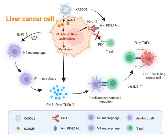 Together, these results are summarized as shown in Figure 6. The anti-PD-L1 Nb coupled to the surface of liposomes achieves active tumor targeting, while the lipid nanocarriers are used to efficiently deliver cGAMP. In terms of mechanism, after XA5508 targets liver cancer cells, it releases cGAMP, activates the intracellular STING pathway, induces the production of immune cytokines, stimulates and activates CD8+ T cells, and simultaneously reverses the immunosuppressive TME characterized by M2-type macrophages, promoting the anti-tumor immune pathway to enhance the efficacy of anti-PD-L1 treatment. Additionally, cGAMP induces an increase in PD-L1 expression on the tumor cell surface, increasing the response rate of anti-PD-L1 Nb, thereby blocking the immune escape pathway of PD-1/PD-L1.