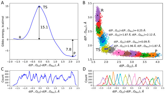 We started with the unconstrained QM/MM dynamics of the ES complex. It was performed for 25 ps and the last 15 ps were utilized for analysis. Next, QM/MM MD umbrella sampling simulations with the addition of biasing potentials to the reaction coordinate were performed to obtain a Gibbs energy profile of the polymerization reaction in the DNA active site of ORF2p. The reaction coordinate was selected as a difference of two distances d(P…OLG)-d(P…ONuc), the distance between phosphorus and oxygen atoms of the leaving group, d(P…OLG), and between phosphorus and oxygen of the hydroxyl group at the 3′ end of the DNA, d(P…ONuc) (Figure 1 and Figure 5). The reaction coordinate was divided into 15 windows and harmonic potentials were centered at the values from −1.7 to 2.6 Å. The force constants of the harmonic potentials in the transition state region were k = 80 or 120 kcal/(mol·Å2), and k = 40 kcal/(mol·Å2) was applied in regions close to the ES and products minima. The production run for each trajectory was 5 ps. Weighted histogram analysis (WHAM) [71,72] and umbrella integration (UI) [73] were utilized to reconstruct a Gibbs energy profile from statistical analysis of distributions of reaction coordinates in the umbrella sampling trajectories. The force constants were selected in such a way that distributions of reaction coordinates from neighboring “windows” overlap. Proper accumulation of statistics was monitored from reaction coordinate distributions in separate runs and their overlaps, as well as the overall coverage of the reaction coordinate (Figure 1C,D).