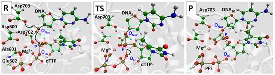 Mechanism of the DNA elongation in the RT domain of the ORF2p. Snapshots correspond to stationary point regions: R—reagents, TS—transition state, P—products. dTTP—thymidine triphosphate, PPi—pyrophosphate. Color code: carbon—green, oxygen—red, nitrogen—blue, and phosphorus—ochre, magnesium—pink, and hydrogen—white.