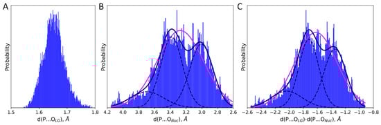 Distributions of distances in the unconstrained QM/MM molecular dynamics of the ES complex for the (A) d(P…OLG), (B) d(P…ONuc), and (C) d(P…OLG)-d(P…ONuc). The magenta line corresponds to the unimodal normal distribution and the navy solid line is a sum of three normal distributions (navy dashed lines for each component) with the corresponding weights.