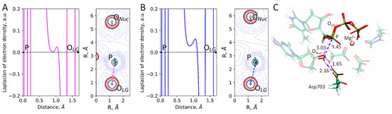The reaction coordinate at the minimum of the reagent states was −1.30 Å (Figure 1), which is close to the mean value of the normal distribution, corresponding to the tightest type of ES states (Table 1). Therefore, the equilibrium geometry configuration obtained from a QM/MM MD frame from this fraction should likely be representative to determine the reaction mechanism type. Still, we also obtained another minimum corresponding to the second major fraction of ES states. Thus, we obtained two ES complexes, a tighter one, EST, with the distance of the nucleophilic attack being 3.03 Å, and a looser one, ESL, with d(P…ONuc) = 3.45 Å (Figure 4C). The Laplacian of the electron density was calculated along the P-OLG bond for both structures (Figure 4) as suggested in ref. [51] to reveal the type of the reaction mechanism. For both minima, there is no electron density concentration area on the P-OLG bond line, which is an indication of the dissociative mechanism.