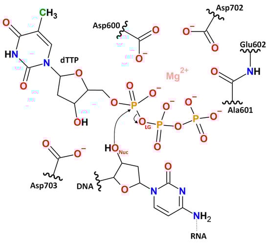 - Castro, C.; Smidansky, E.; Maksimchuk, K.R.; Arnold, J.J.; Korneeva, V.S.; Götte, M.; Konigsberg, W.; Cameron, C.E. Two proton transfers in the transition state for nucleotidyl transfer catalyzed by RNA- and DNA-dependent RNA and DNA polymerases. Proc. Natl. Acad. Sci. USA 2007, 104, 4267–4272. [Google Scholar] [CrossRef]
