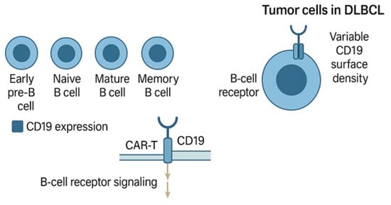 Clinical studies have demonstrated that CD19 expression is frequently preserved at relapse following CD19-targeted therapy, although density and accessibility may be altered. For instance, Duell et al. [] showed that patients relapsing after tafasitamab retained detectable CD19 by IHC and mRNA analysis, supporting the rationale for subsequent CD19-targeting, including CAR-T therapy, provided that epitope masking is resolved [,].