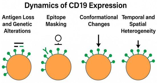 Furthermore, CD19 expression is not static and may evolve over the course of therapy. Post-treatment changes in expression may arise from several mechanisms, including genetic mutations (e.g., in exons 2–4), alternative mRNA splicing leading to truncated isoforms, transcriptional downregulation, or even epitope masking due to antibody binding. These changes can be either permanent or transient and may vary depending on the specific CD19-targeted agent administered, the duration of exposure, and the interval between treatments [].