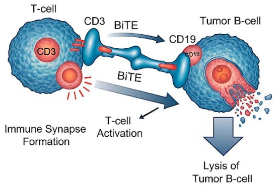 Bispecific T-cell (Figure 3) engagers (BiTEs) and trispecific antibodies targeting CD19 constitute another frontier in immunotherapy, offering off-the-shelf, non-cellular strategies for redirecting immune effector cells toward malignant B-cells.