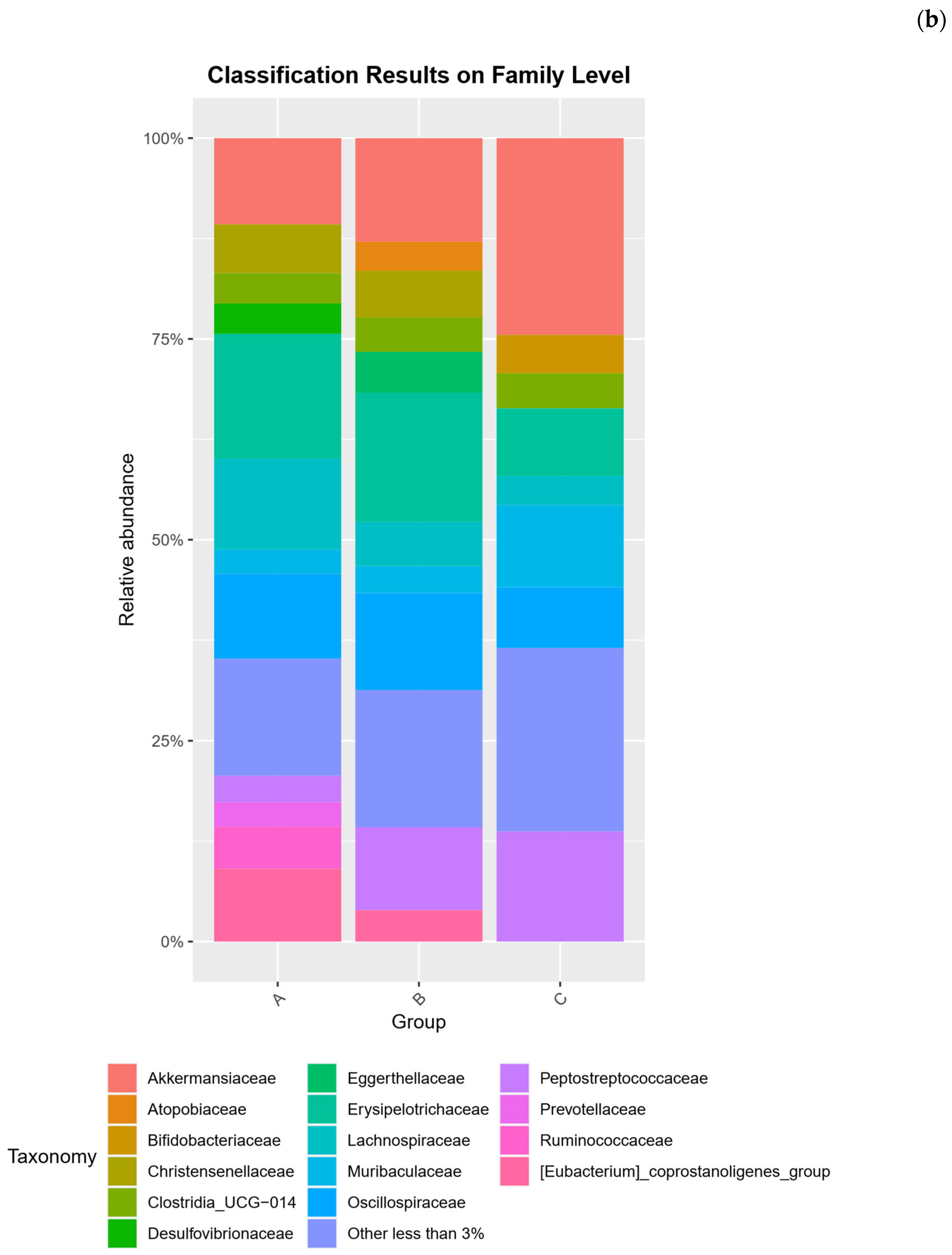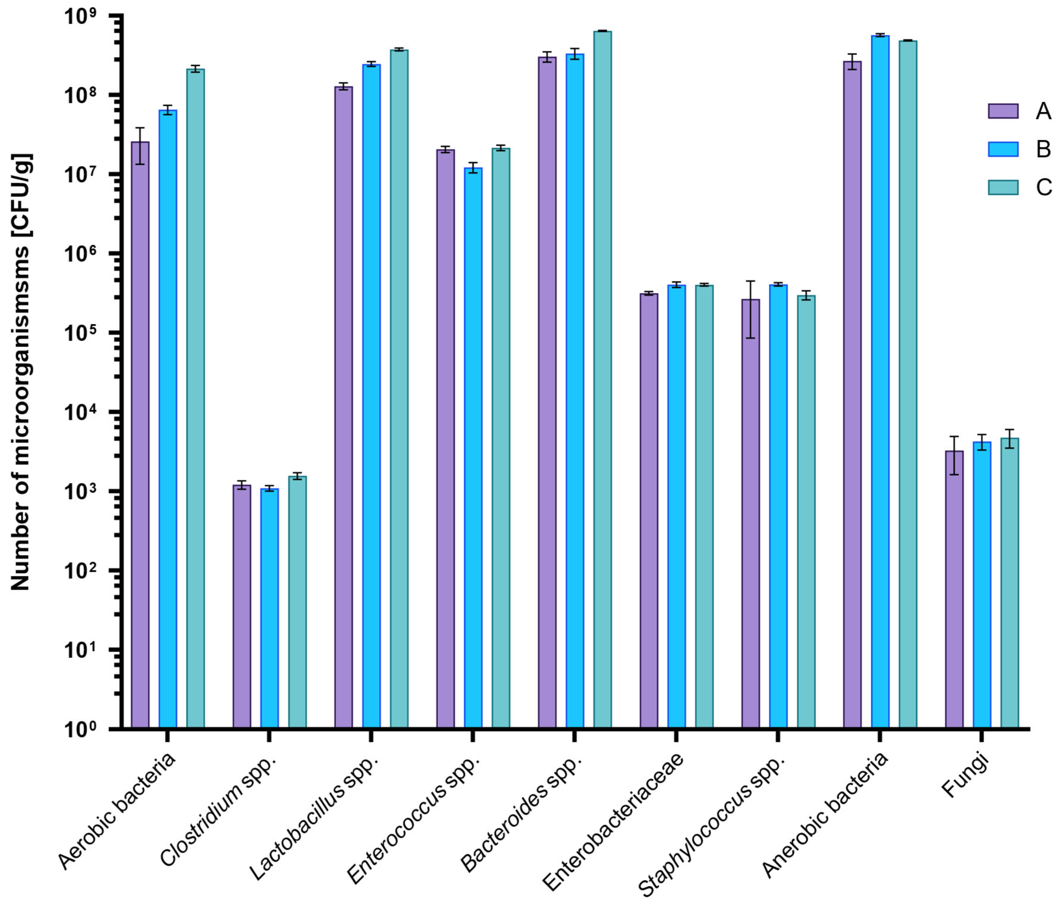 4.3. Microbiological Analysis of Rats Feces