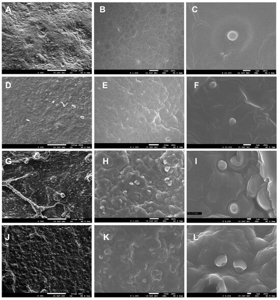 For the P1 and P2 film samples at 250× magnification, the surface appeared relatively homogeneous and slightly undulating (Figure 1A,D), contrasting with the freeze-dried samples, which exhibited a heterogeneous, bubble-like structure (Figure 1G,J). At 1200–1300× magnification, spherical structures/capsules were uniformly distributed across the surface of the freeze-dried samples (Figure 1H,K), while at 5000× magnification, capsules with a diameter of approximately 2000 nm were clearly observed for P1 (Figure 1I), with slightly larger ones for P2 (Figure 1L). In film samples, capsules were not visible on the surface at 1200× magnification (unlike in freeze-dried samples) (Figure 1B,E), as they were embedded within the polysaccharide matrix. However, at 10,000× magnification, spherical capsules measuring 800–1000 nm in size were revealed (Figure 1C,F). It was observed that the concentration of nanoemulsions has a demonstrable impact on the dimensions of the resulting capsules. Capsules in sample P1 exhibited a mean diameter approximately twice that of the capsules in sample P2.