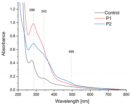 Figure 2. UV-Vis spectra of the pectin film (control sample) and pectin composites containing an emulsion of propolis and sea buckthorn oil (P1 and P2).