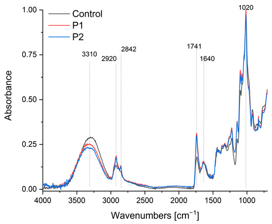 Figure 3. FTIR-ATR spectra of the pectin film (control sample) and pectin composites containing an emulsion of propolis and sea buckthorn oil (P1 and P2).