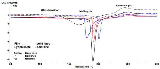 The results of the DSC analysis of the investigated samples are presented in Table 3 and Table 4. Example thermograms are shown in Figure 4.