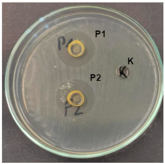 Figure 5. Growth inhibition zones of S. pyogenes under the influence of composites (K—control, P1, and P2).