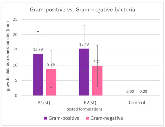 Figure 6. Mean growth inhibition zones in mm (bars represent standard deviations) for Gram-positive and Gram-negative bacteria caused by the application of propolis/sea buckthorn composites. The differences are not statistically significant both for P1 (p = 0.109) and for P2 (p = 0.076).