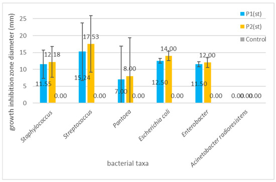 Figure 7. Graph showing the differences in the mean growth inhibition zones (bars represent standard deviations) for the examined bacterial taxa. The differences are statistically not significant (p = 0.245 for P1; p = 0.097 for P2), with the exception of the differences between Streptococcus spp. and A. radioresistens (LSD test: p = 0.044 for P1; 0.023 for P2).