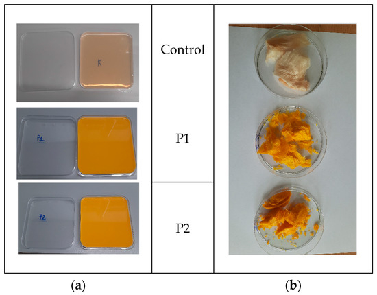 The presence of an oil emulsion in the polysaccharide matrix affects its darkening, because the fat droplets scattering light reduce the transparency of the matrix. The observed effect will depend on the size of the particles and their concentration [73]; hence, the observed differences in P1 and P2 biocomposites. The brightness of the biocomposites is also affected by the presence of substances rich in pigments that occur in propolis and sea buckthorn oil. Further results confirm that the biocomposites are a rich source of phenolic compounds. Sample P2 contains up to 40% more phenolics than sample P1 (Table 8). Thickness is also an important factor influencing the perceived brightness of an object. In the analyzed biocomposites, significant differences in this parameter were observed. The P2 biocomposite exhibited more than twice the thickness of the P1 sample (Table 1), which affected the degree of incident light reflection. A similar relationship has also been reported by other researchers [74,75].