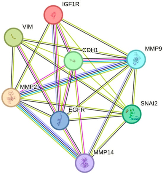 2.5. Protein–Protein Interactions of EGFR/IGF-IR with EMT Markers and Matrix Remodeling Enzymes