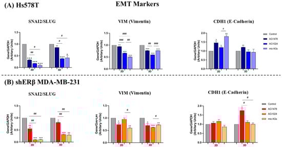 2.6. EGFR/IGF-IR Inhibition Effects on Gene Expression of EMT Markers and MMPs in 2D and 3D TNBC Cell Cultures