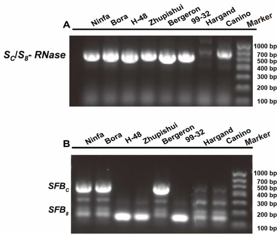 - Sonneveld, T.; Tobutt, K.R.; Robbins, T.P. Allele-specific PCR detection of sweet cherry self-incompatibility (S) alleles S1 to S16 using consensus and allele-specific primers. Theor. Appl. Genet. 2003, 107, 1059–1070. [Google Scholar] [CrossRef]