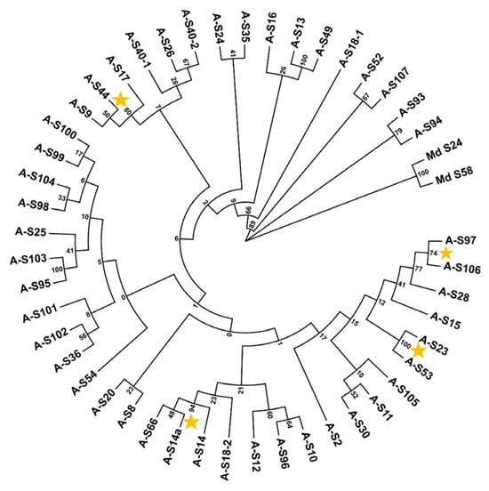 - Liu, Z.; Gao, Y.; Wang, K.; Feng, J.; Sun, S.; Lu, X.; Wang, L.; Tian, W.; Wang, G.; Li, Z.; et al. Identification of S-RNase genotype and analysis of its origin and evolutionary patterns in Malus plants. J. Integr. Agric. 2024, 23, 1205–1221. [Google Scholar] [CrossRef]