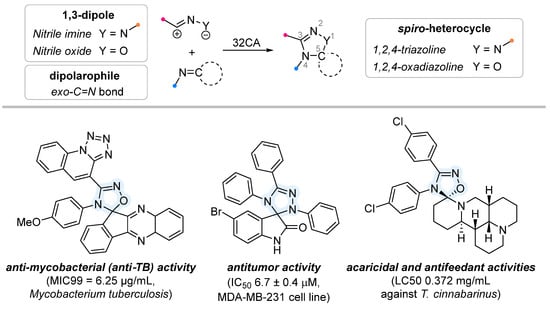 Petrova, J.V.; Kukushkin, M.E.; Beloglazkina, E.K. 1,3-Dipolar Cycloaddition of Nitrile Imines and Nitrile Oxides to Exocyclic C=N Bonds—An Approach to Spiro-N-Heterocycles. Int. J. Mol. Sci. 2025, 26, 8673. https://doi.org/10.3390/ijms26178673