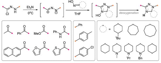 - Deepthi, A.; Acharjee, N.; Sruthi, S.L.; Meenakshy, C.B. An Overview of Nitrile Imine Based [3+2] Cycloadditions over Half a Decade. Tetrahedron 2022, 116, 132812. [Google Scholar] [CrossRef]