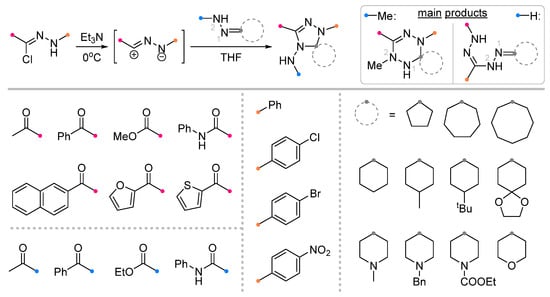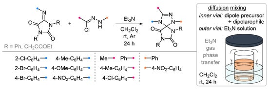 - Huisgen, R.; Grashey, R.; Kunz, R.; Wallbillich, G.; Aufderhaar, E. 1.3-Dipolare Cycloadditionen, XVII: BisaddukteAusNitriliminen Und Carbodiimiden. Chem. Berichte 1965, 98, 2174–2184. [Google Scholar] [CrossRef]