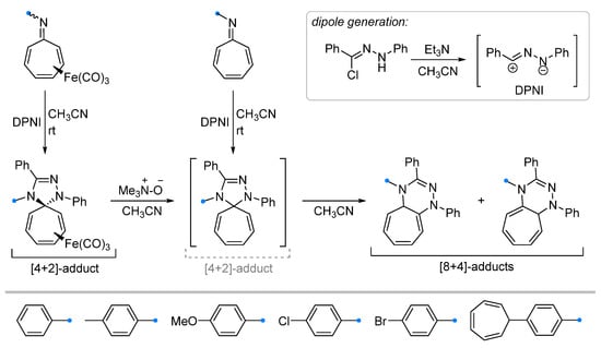 - Gandolfi, R.; Toma, L. Site specificity in cycloadditions of diphenylnitrile imine with 8-substituted-8-azaheptafulvenes and tricarbonyl (8-azaheptafulvene) iron complexes. Tetrahedron 1980, 36, 935–941. [Google Scholar] [CrossRef]