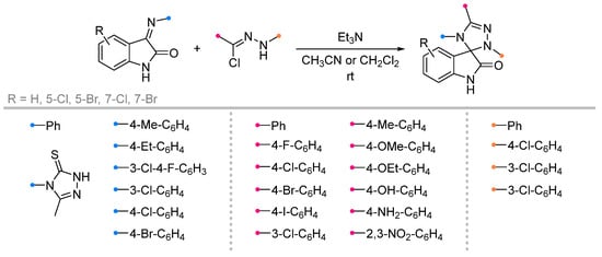 - Azizian, J.; Soozangarzadeh, S.; Jadidi, K. Microwave-Induced One-Pot Synthesis of Some New Spiro[3H-Indole-3,5′(4′H)-[1,2,4]Triazoline]-2-Ones. Synth. Commun. 2001, 31, 1069–1073. [Google Scholar] [CrossRef]