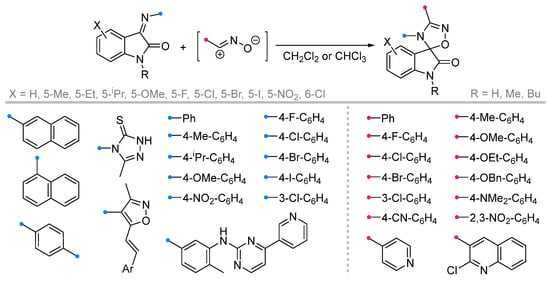 - Molteni, G.; Silvani, A. Spiro-2-oxindoles via 1,3-dipolar Cycloadditions. A Decade Update. Eur. J. Org. Chem. 2021, 2021, 1653–1675. [Google Scholar] [CrossRef]
